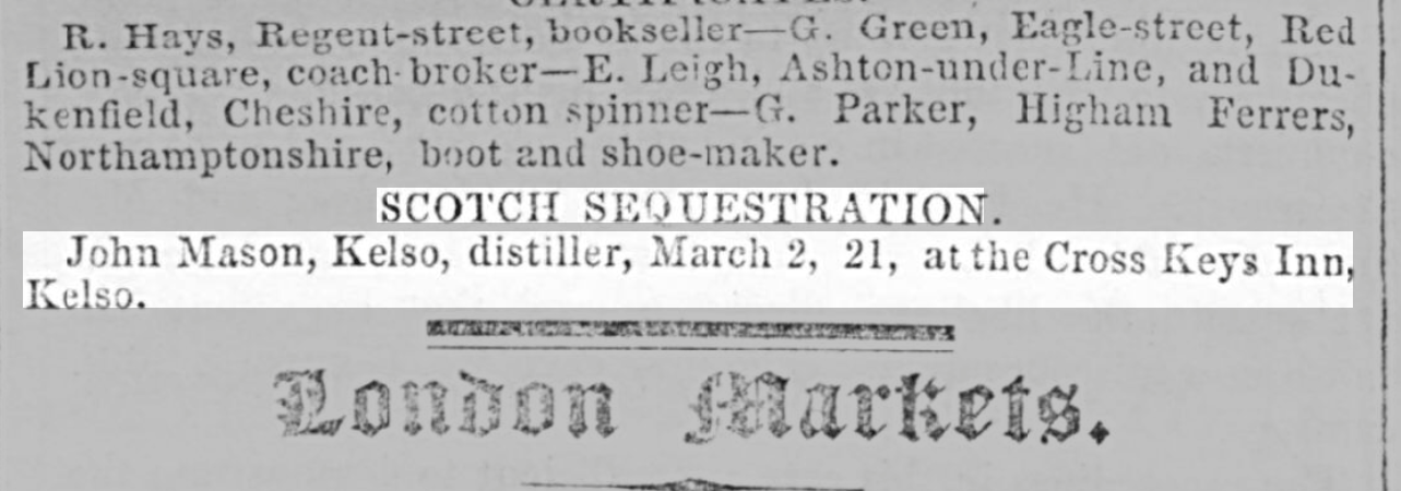 Given that the owner of the distillery, John Mason, went bankrupt in 1837 makes me thing this was probably the case. And between 1830 and 1833, Mason had a partner in the business - Peter Nichol - who also later went bankrupt.
