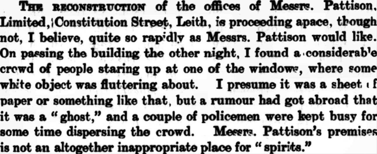 These ‘eerie’ events took place at Pattisons Ltd’s headquarters, located at the corner of Constitution Street, right where Leith Walk meets the start of Great Junction Street. Today, the building is home to a British Heart Foundation shop, but back in the late 1800s, it was the bustling nerve centre of the Pattisons’ business.